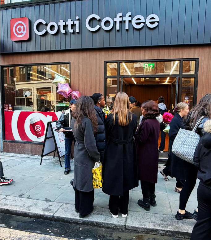 Market Signal: Cotti is exporting its domestic lean-store economics without significant adaptation for Western seating expectations. The low price point relative to UK specialty coffee averages suggests the brand is testing whether volume-driven, takeaway-focused models translate across markets.